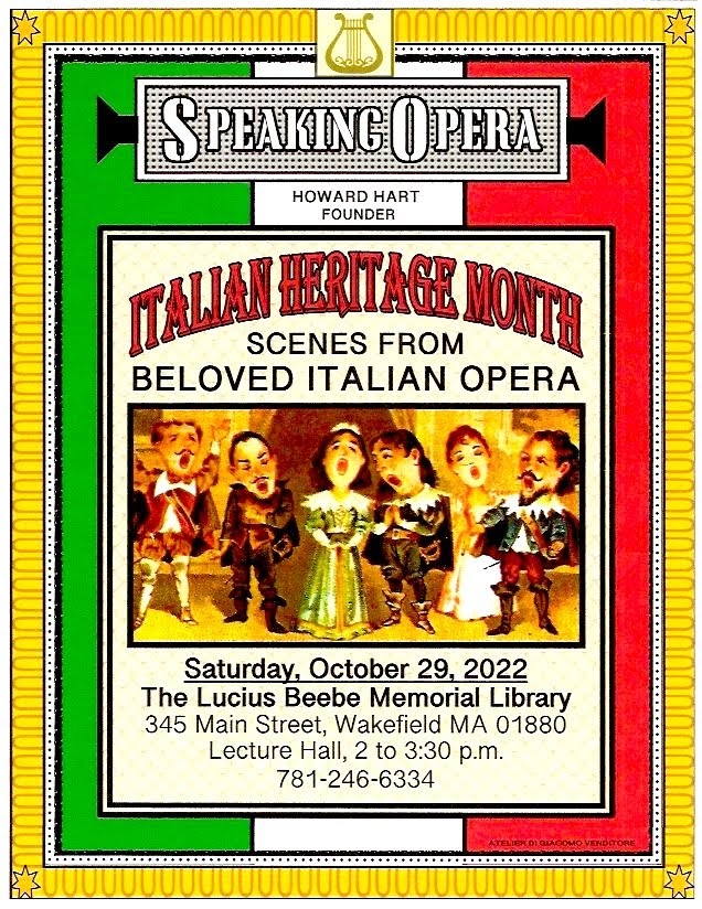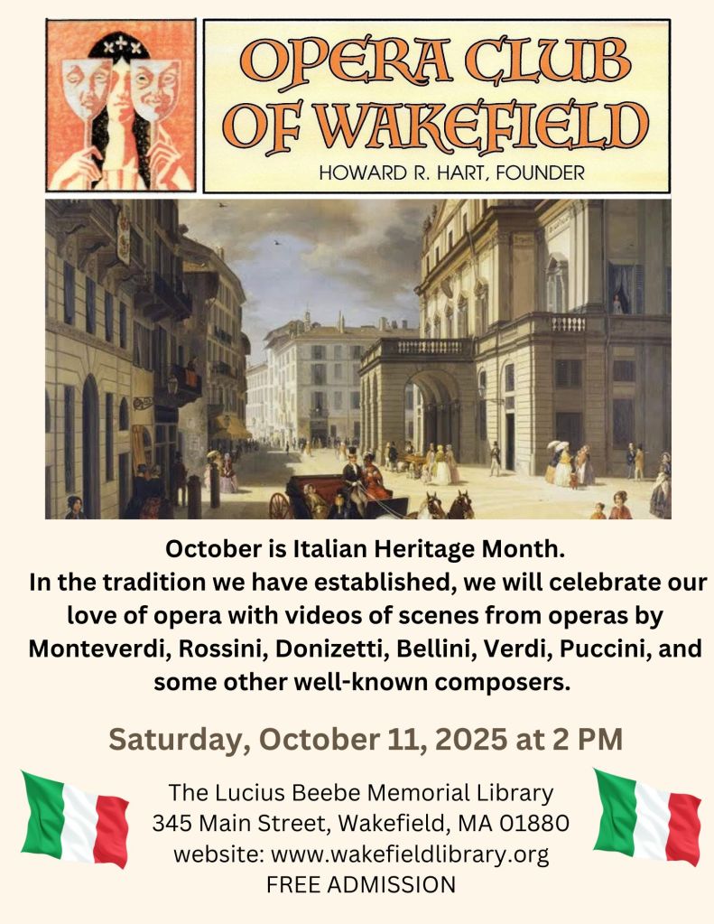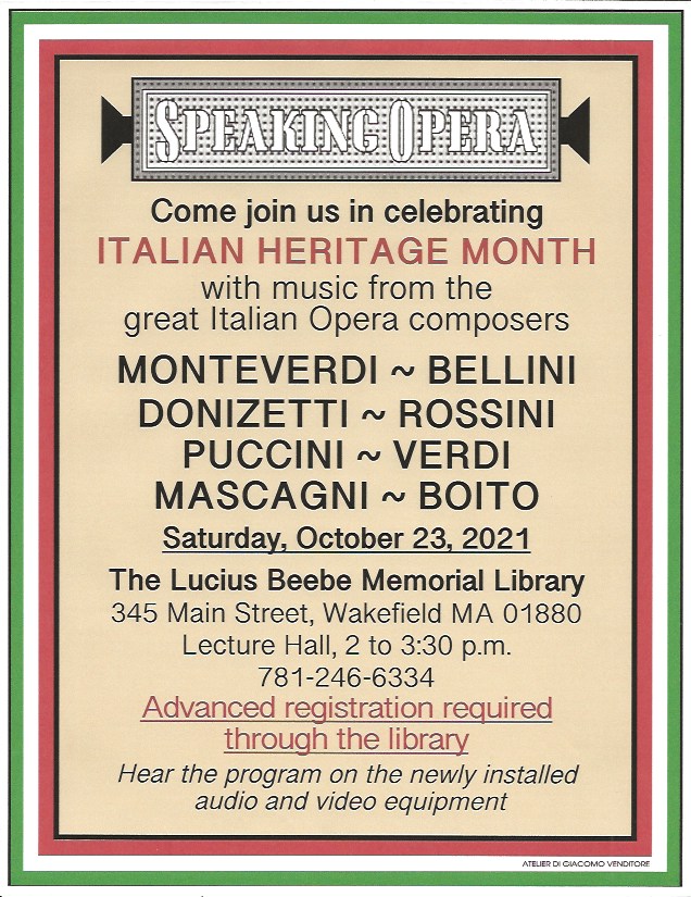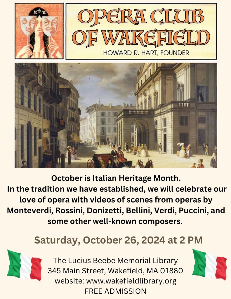 I am the bearer of good news in a very challenging time. Catherine McDonald, the director of the Lucius Beebe Memorial Library, home to our opera club for the last five years, has informed me that the lecture hall where we hold our club meetings has been outfitted with incredible new audio and visual equipment. I auditioned the sound and video for several programs that we will be watching for our upcoming meeting and was overwhelmed at the quality of both. October is Italian Heritage Month. In the tradition we have established in the past we will celebrate our love of opera with music by Monteverdi, Rossini, Donizetti, Bellini, Verdi, Puccini, and some other well-known composers. I do have some surprises which will be added to the program.