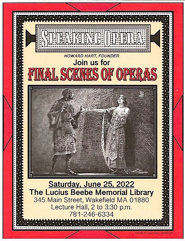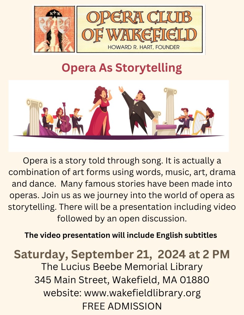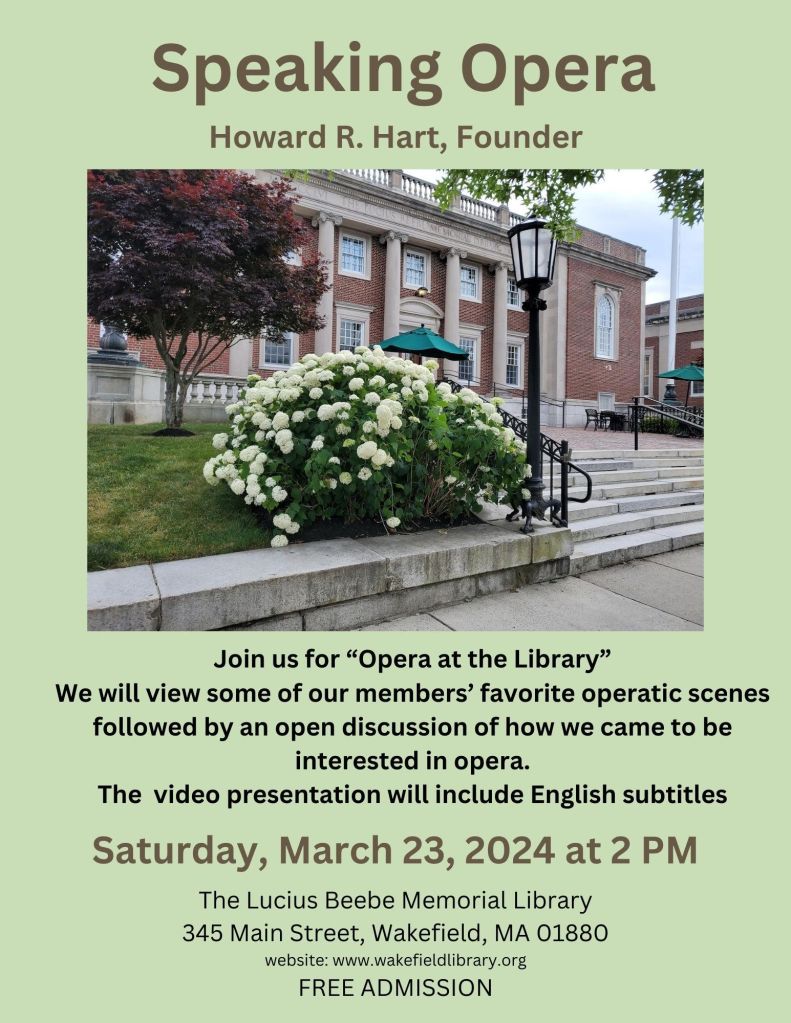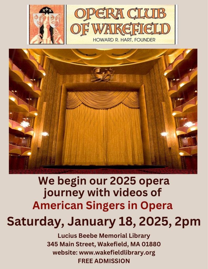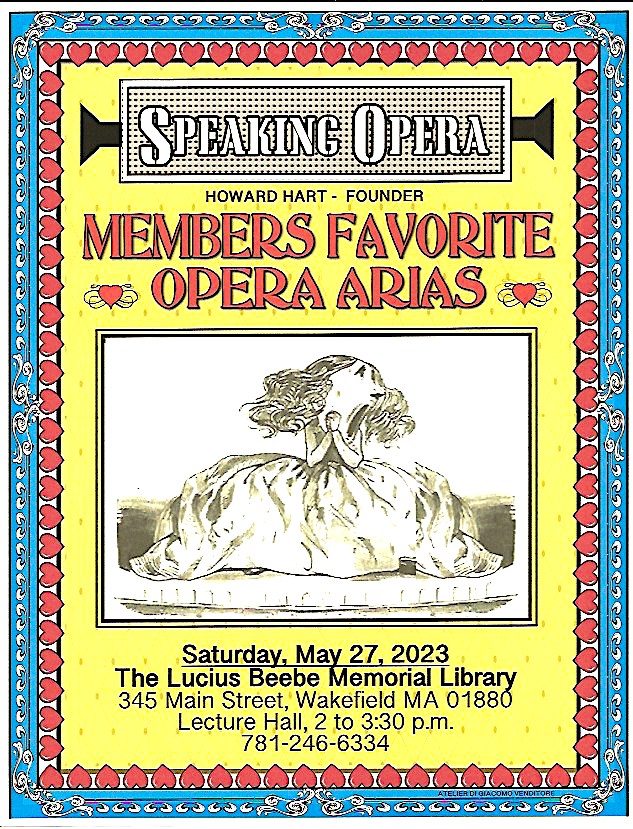 All meetings will be held at the Lucius Beebe Memorial Library on the Saturdays as announced from 2:00 PM to 3:30 PM. Dates for the opera club meetings through the end of the year can be found on the library’s calendar of scheduled programs.