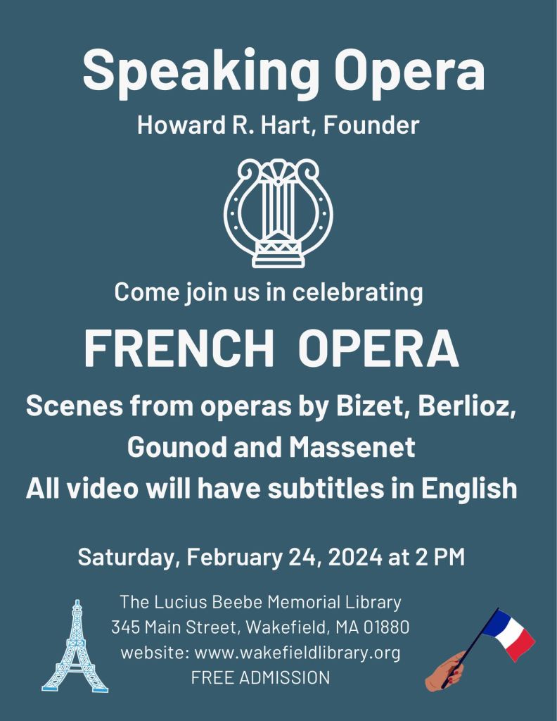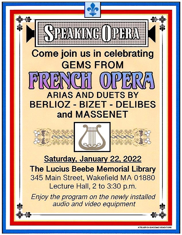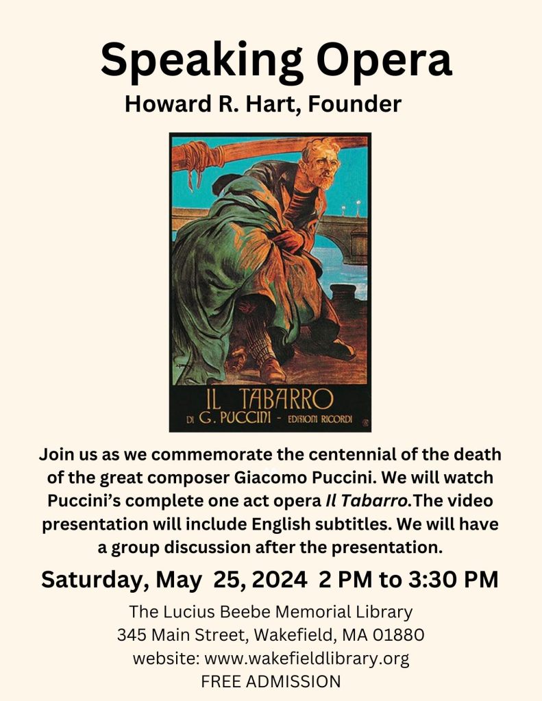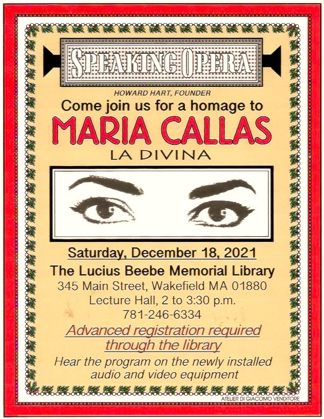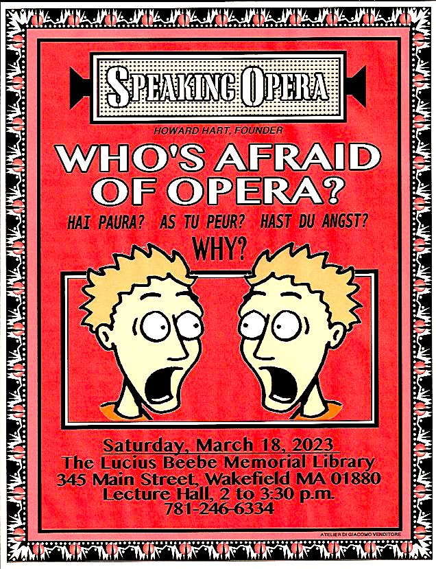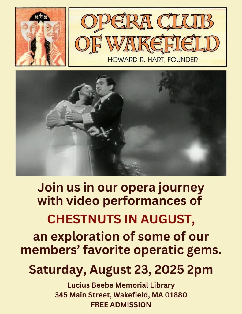 All meetings will be held at the Lucius Beebe Memorial Library on the Saturdays as announced from 2:00 PM to 3:30 PM. Dates for the opera club meetings through the end of the year can be found on the library’s calendar of scheduled programs.