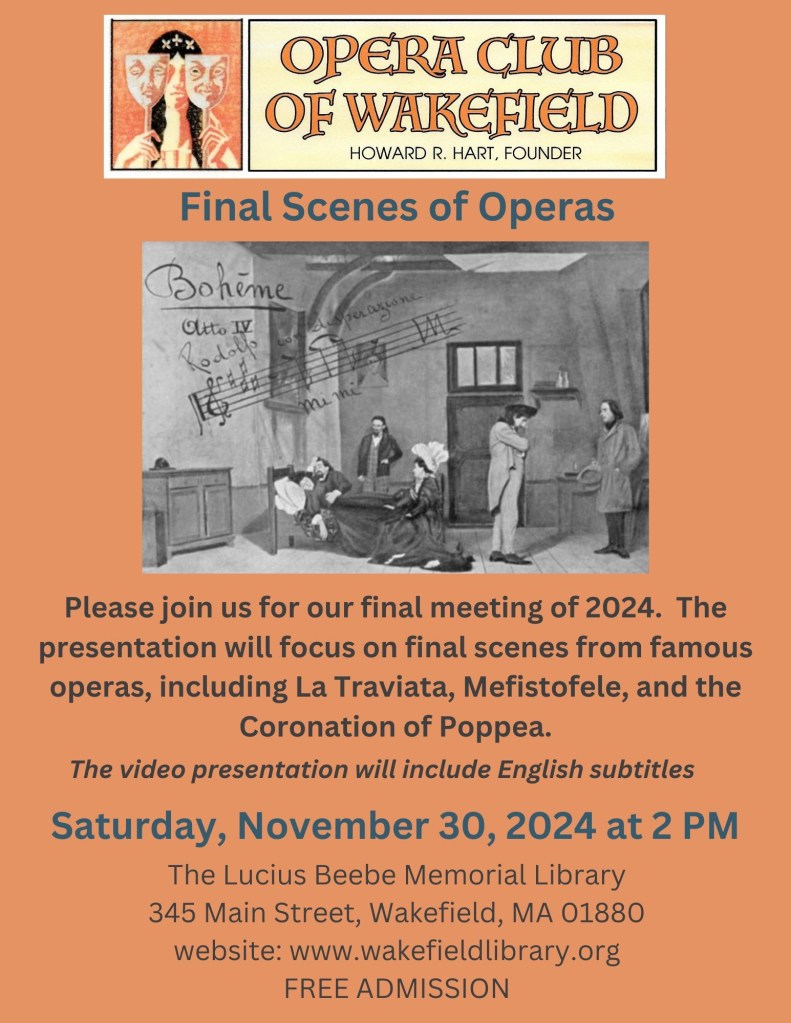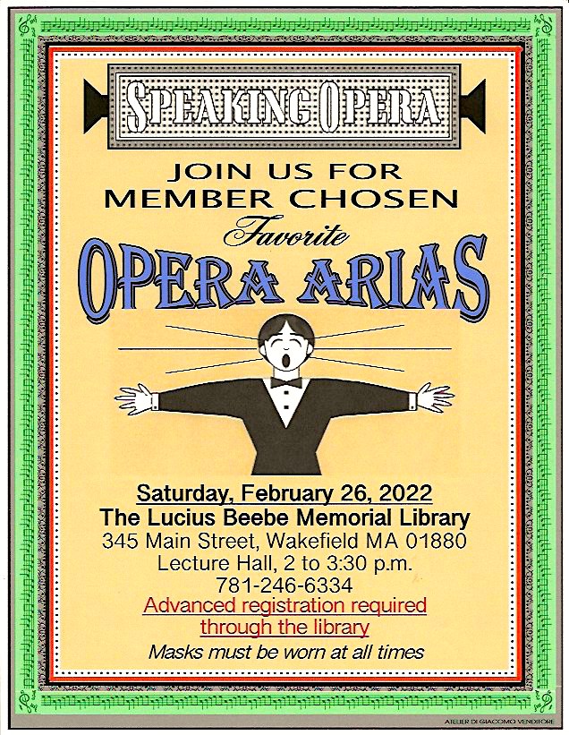 Our opera club meeting will take place on Saturday November 27, 2021, from 2:00 until 3:30. Due to the Covid-19 restrictions that have been put in place by the town of Wakefield, there is a mask mandate for the library. It has also been determined that, to assure a safe environment for our meeting, it will be necessary to register to attend prior to the meeting. This can be done by going to the library website. You will find it on the calendar for November. Should you have any problems you can contact the library and they will walk you through the necessary steps for registration to attend the meeting.