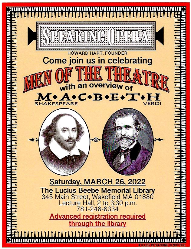 We continue our journey in opera with Men of the Theater – Verdi and Shakespeare. We’ll hear music from Macbeth, the first of three operas written by Verdi based on plays by Shakespeare. The other two are Otello and Falstaff (The Merry Wives of Windsor, King Henry IV). Verdi had definite plans for an opera based on King Lear but it never came to fruition. Come join us as we investigate the similarities between the play by Shakespeare and the opera composed by Verdi.