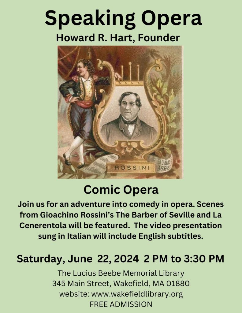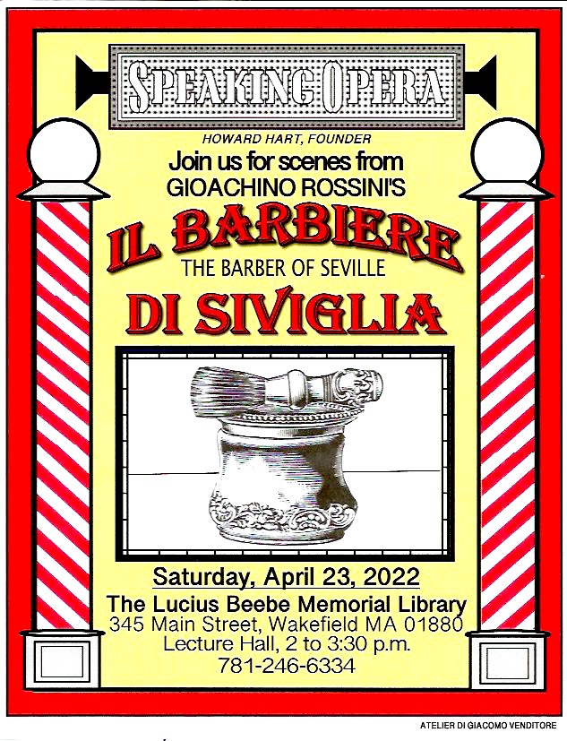 Spring is here and what better way to add some joy to your life than by joining us in our journey in opera on Saturday, April 23rd, at The Lucius Beebe Memorial Library. The opera for April is Il Barbiere di Siviglia (The Barber of Seville). We’ll watch Rossini’s beloved opera with English subtitles (with the library’s new audio video equipment) and see many of the famous scenes that have made it so popular with the opera-going public. The main character, Figaro, is a busy factotum and we’ll be interested to see his matchmaking between Rosina and Count Almaviva (disguised as the student Lindoro and later as a tipsy soldier). There are many shenanigans going on with Figaro in the middle of it all, making it one of the truly great comic operas. I hope to see you at our opera club meeting. Put some joy into your life with opera!