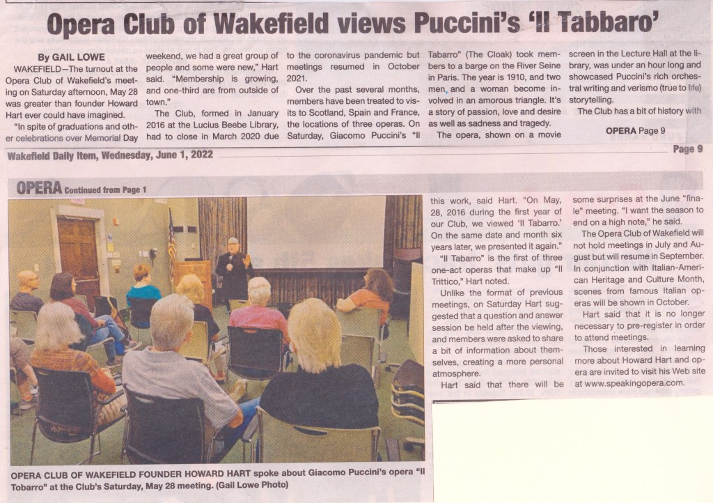 The following is an article from The Wakefield Daily Item written by Gail Lowe that was mentioned during our meeting on June 25th. Regrettably, I wasn’t given the opportunity to proof the copy and the title of the opera, Il Tabarro, is misspelled in the headline. Nonetheless, it’s a nice article and I am forwarding it as promised.