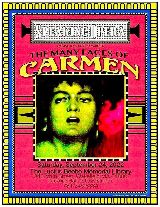 As the curtain goes up, figuratively speaking, at our opera club meetings for 2023, the work begins. Work has already commenced on preparing the agendas for the new year. To begin, topics for presentations were formulated. The library assisted in coordinating the calendar and dates are now set for our club meetings through the end of the year. Jim Sellers (a/k/a Giacomo Venditore), our brilliant graphic artist who has created all the artwork to accompany the email announcements as well as the posters seen in the Lucius Beebe Memorial Library, local shops, and newspapers, sprang into action. Wonderful artwork has been designed for our opera club.