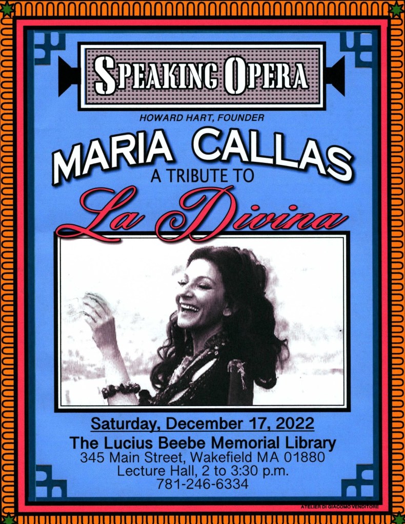 I will present audio and video performances from La Divina’s career, but you will also hear Maria’s life story as told by the woman herself in live video interviews from different periods of her life. Naturally, we will hear the aria “Vissi d’arte” (from Puccini’s Tosca) performed by Callas as it is a culmination of the joys, sorrows, triumphs, and disappointments in the life of a woman and singer who lived for her art.