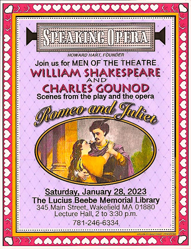 On January 28th the presentation will be William Shakespeare & Charles Gounod: Romeo and Juliet/Roméo et Juliette – Scenes from the Play and Opera. We’ll watch scenes from the play, such as the well-known “Balcony Scene”, and the corresponding scene in the opera (shown with English subtitles). We’ll also sample some of the opera by itself. Join us as we investigate the parallels between the play by Shakespeare and the opera composed by Gounod.