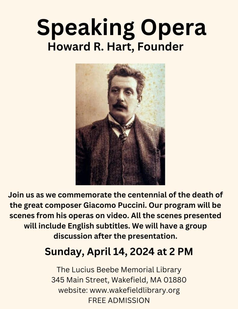 Join us as we commemorate the centennial of the death of the great composer Giacomo Puccini. Our program will be scenes from his operas on video. All the scenes presented will include English subtitles. We will have a group discussion after the presentation.