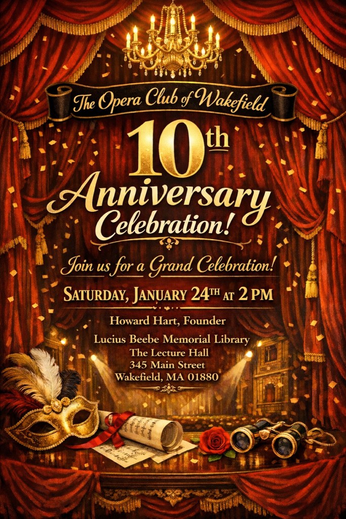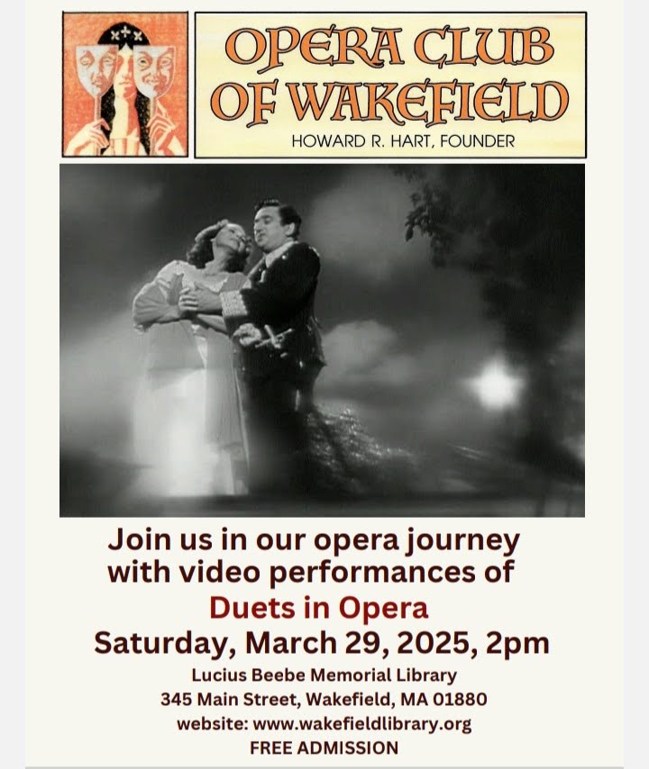 Through my research over the years, I discovered that the Opera Club of Wakefield holds a unique place nationally: it is the only regularly scheduled, library-funded opera program in the United States. This remarkable distinction reflects not only the vision that inspired the club, but also the dedication of our community and the steadfast support of the Lucius Beebe Memorial Library.